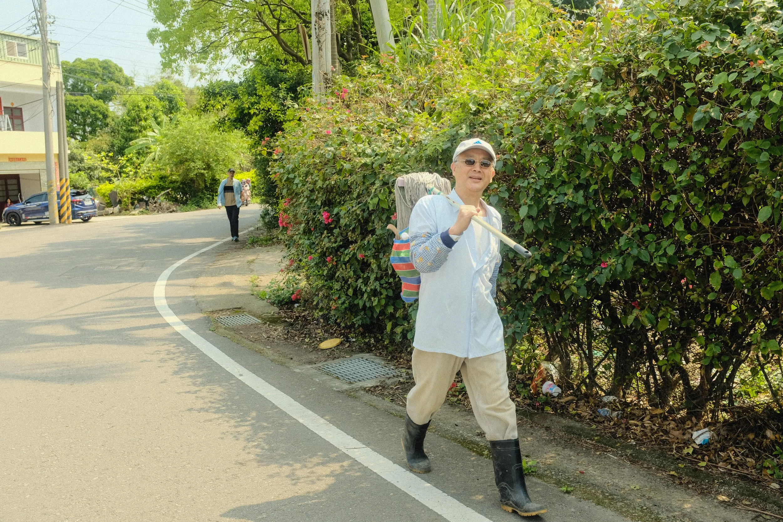 My uncle, prepared with a broom and a bagful of tools to weed and lop anything he deems overgrown.